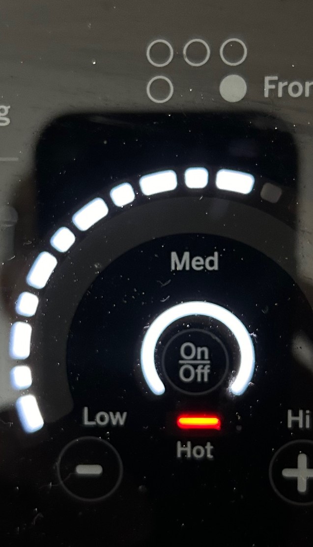 - Heat 1 ½ Tablespoons of oil in the big Dutch oven over medium-high heat, (Front right eye on Med plus one). Add half the beef and cook until well browned all over, about 7 minutes. Using slotted spoon, transfer the beef to bowl with the remaining uncooked beef.